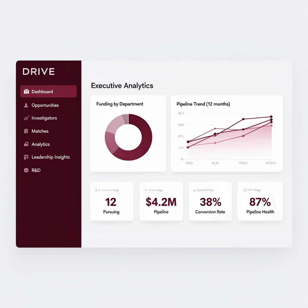 DRIVE gives VPRs, deans, and associate provosts executive-level visibility into the research funding landscape — portfolio analytics, capacity gaps, conversion metrics, and strategic recommendations.