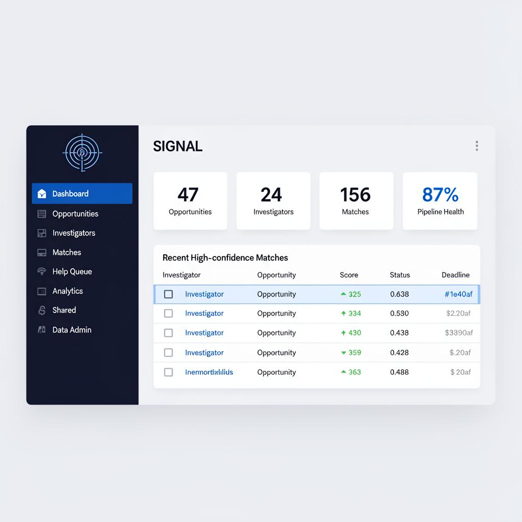 SIGNAL gives your research development team complete pipeline visibility — from opportunity ingestion to proposal submission. Proactively support faculty, manage matches at scale, and track conversions.
